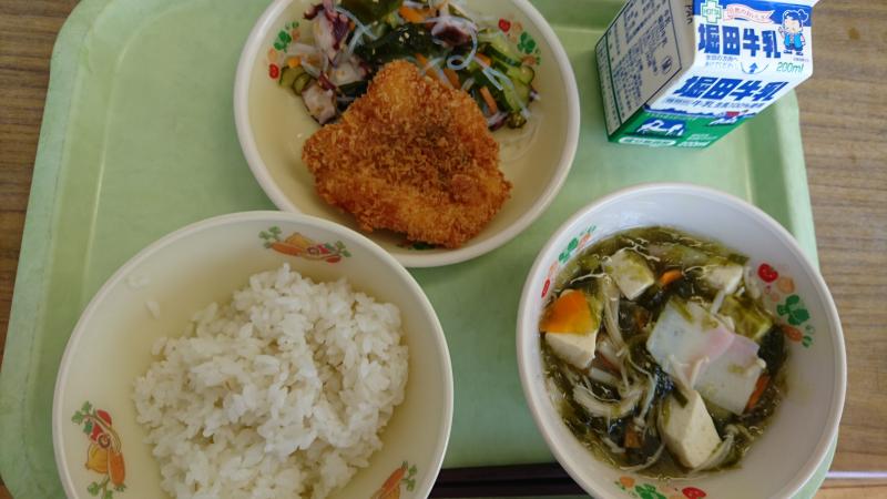 今日の献立は、麦ごはん、はものフライ、たこの酢の物、青さ汁でした。今日は上天草産のフルコースです。お米は教良木、はも、たこ共に上天草産、青さは北垣水産さんから納めていただきました。高級魚のはもは肉厚で食べごたえがあり、見た目はトンカツ?のようで、子どもたちも喜んで食べていました。