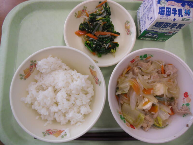 今日の献立は、ごはん、すき焼き風煮、ほうれん草のごま和えでした。給食時間はマスクを外し、感染が起きやすい時間帯のため、学校では換気をしながらの給食です。このため、温かいごはんやおかずもあっという間に冷たくなってしまいますが、無言準備、無言給食を徹底して、できるだけ短時間で食べましょう。コロナ禍を乗り切るぞー!