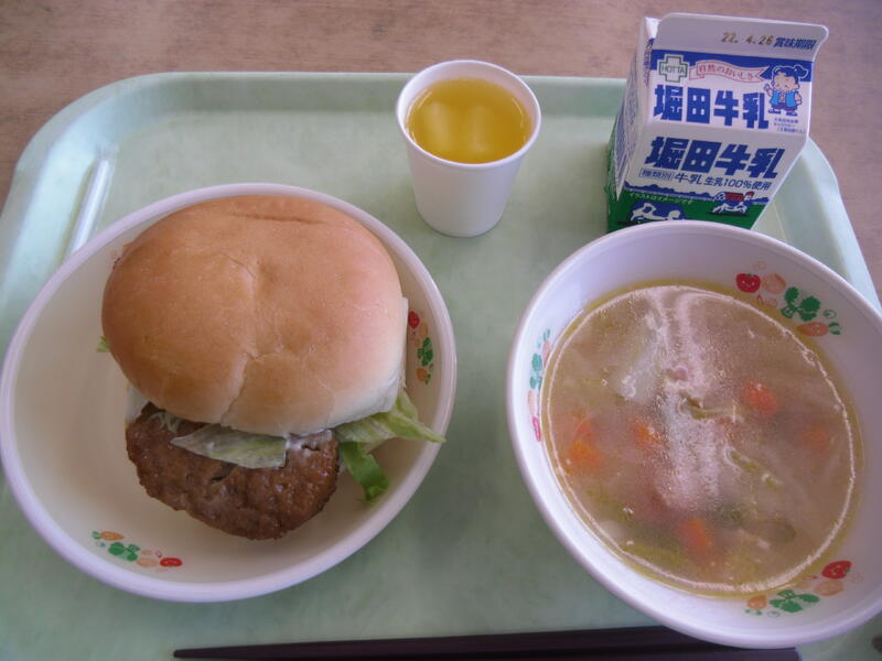 今日の献立は、てりやきバーガー、春野菜コンソメスープ、デコポンパインゼリーでした。2年生以上の子どもたちはセルフバーガーでしたので、各自の作り方でてりやきバーガーを完成させました。スープの中には、今が旬の新玉ねぎと春キャベツ、新じゃがいもが入っていました。コンソメ味ととても良く合い、野菜のうま味がよく出ていました。デザートは予定していたスライスパインが終売になったとのことで、急遽手作りのカットパイン入りでこぽんゼリーを作りました。