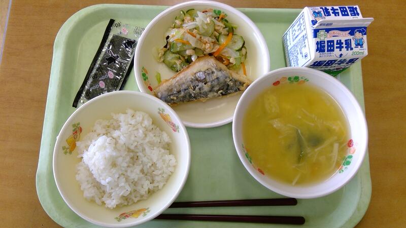 今日の献立は麦ごはん、味付けのり、さばの塩から揚げ、胡瓜の納豆和え、かぼちゃのみそ汁でした。さばは、塩からあげのたれに漬け込み、小麦粉・澱粉をつけて揚げました。