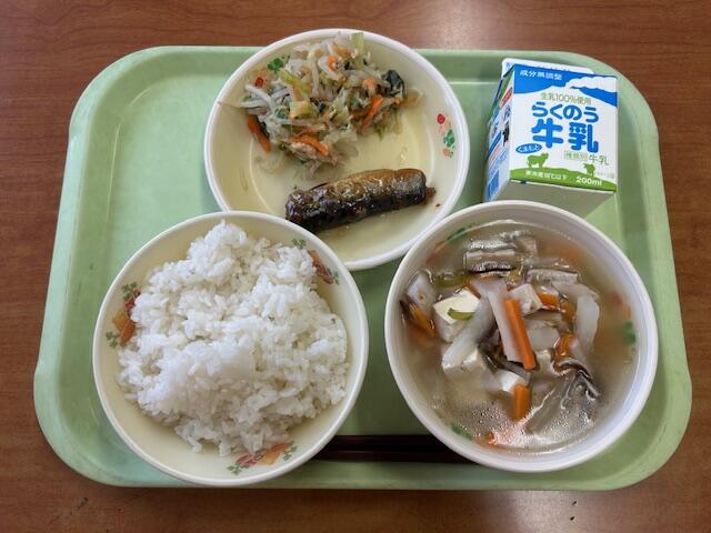 12月17日(火)麦ごはん、牛乳、いわしの梅煮、ツナと野菜の和え物、けんちん汁