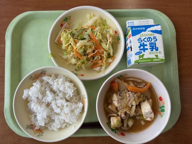 12月16日(月)麦ごはん、牛乳、豆腐チゲ、中華サラダ