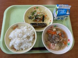 1月15日(水)麦ごはん、牛乳、いわしの生姜煮、ゆかり和え、のっぺ汁