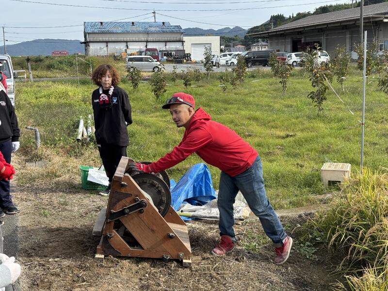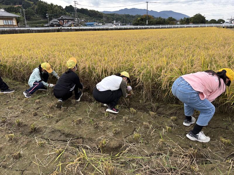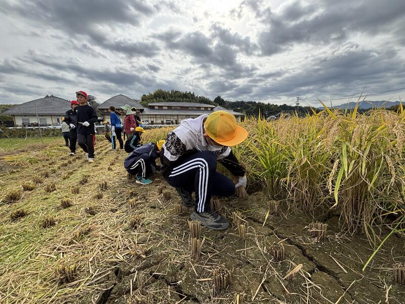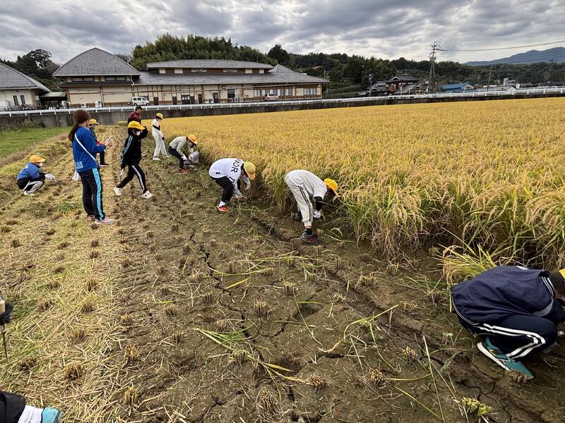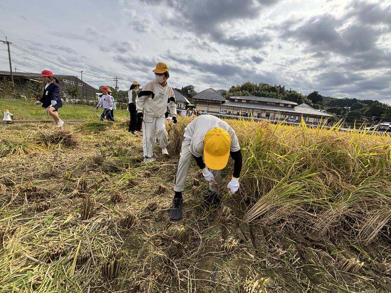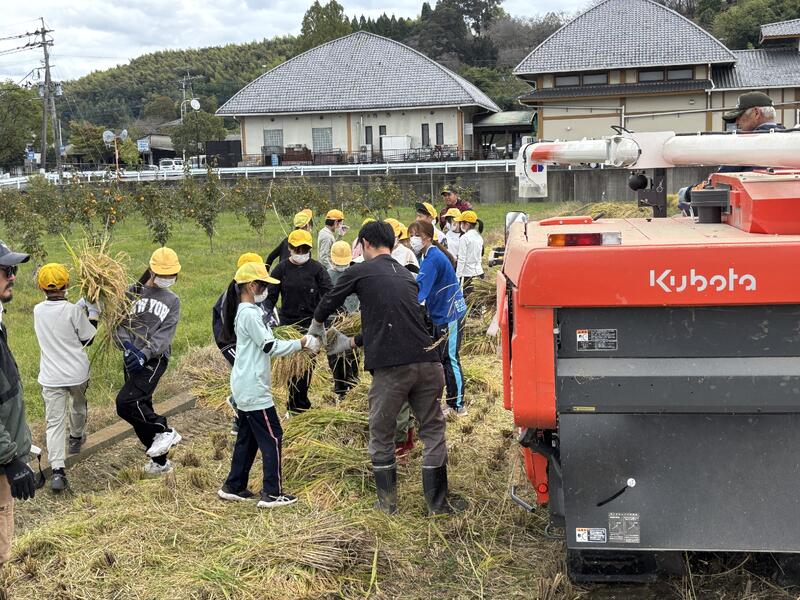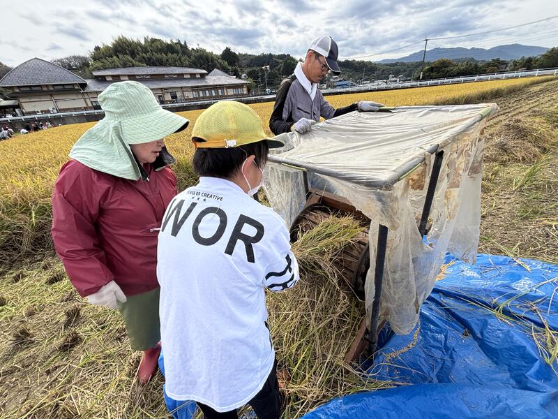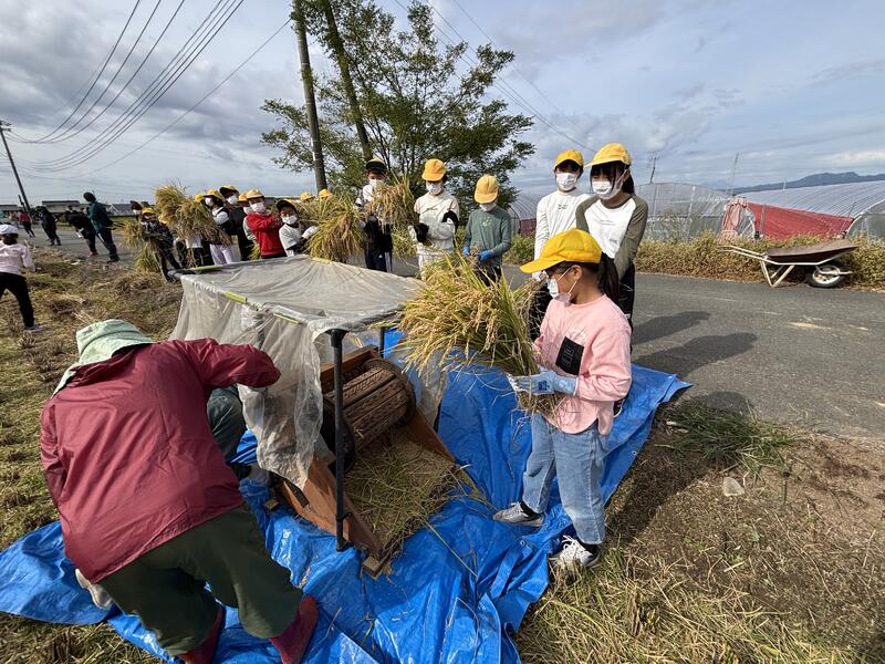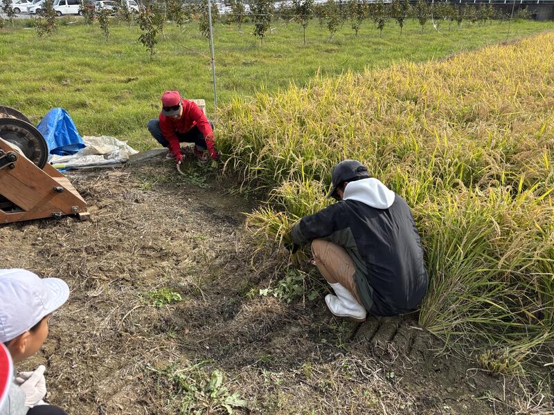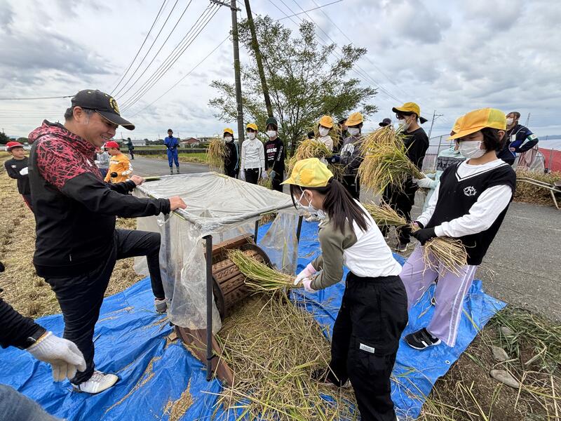 「のこぎり鎌」を使った稲の刈り取りや「足踏み脱穀機」を使った「脱穀(だっこく)」などの体験、コンバインでの稲刈りと脱穀の様子の観察など、収穫体験に加え農業の歴史や機械化の推移を学ぶ機会にもなりました。