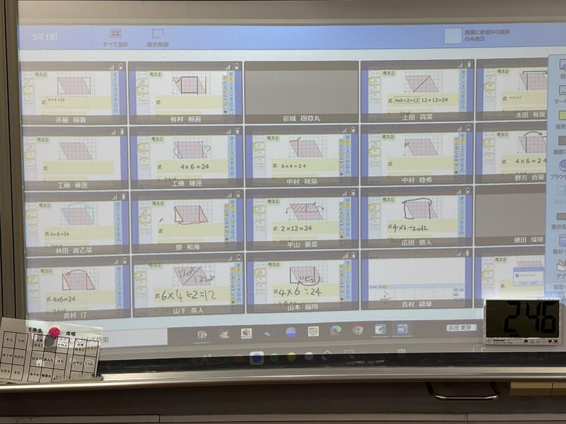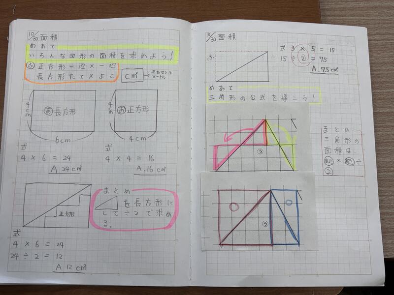 既習事項を活かしながら、いろいろなアイデアで面積を求めようとする姿がありました。