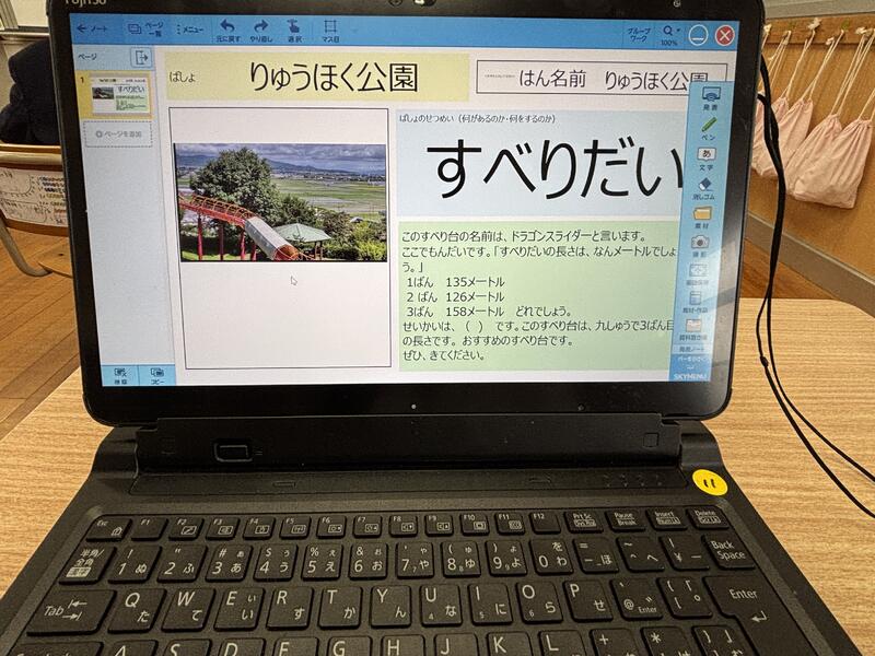 何をしてるのか覗いてみると、生活科の時間に、各グループで調べ、プレゼンにまとめた「町のきらり」を発表していました。発表を聞いている子どもたちは、発表の内容や発表の仕方(声の大きさ、話す速さ)などについて、アドバイスをしています。そして、それをふまえて担任の藤田先生から、今後の取組について確認が行われています。