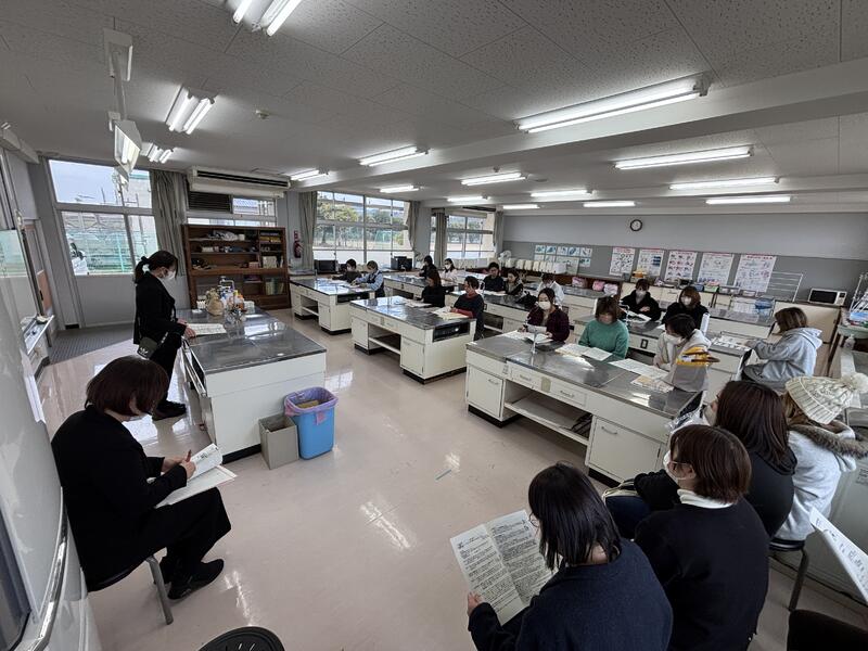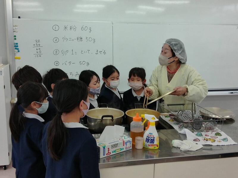 準備が整った家庭科室に、身なりを整えた1年生が入ってくると、いっそうにぎやかになりました。