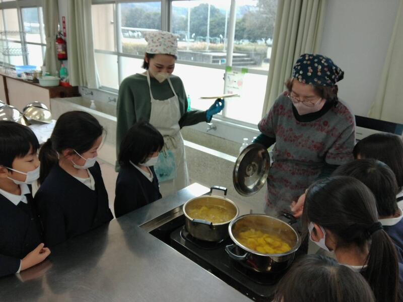 地域学校協働活動推進員の皆さん(古閑さん、三枝さん、山村さん+娘さん)が、1年生が3・4時間目に行う「さつまいもの『ちゃきんしぼり』」の仕込みをされていました。