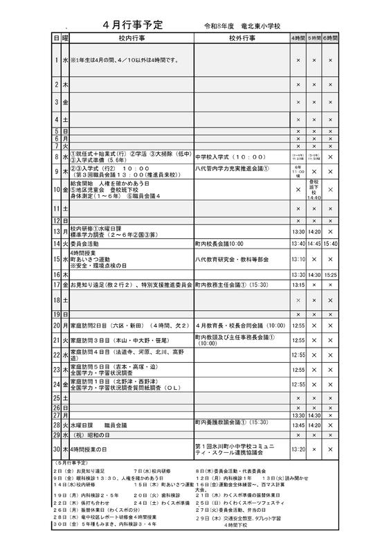 令和8年度の4月の下校予定は、現在のところ以下の通りです。
