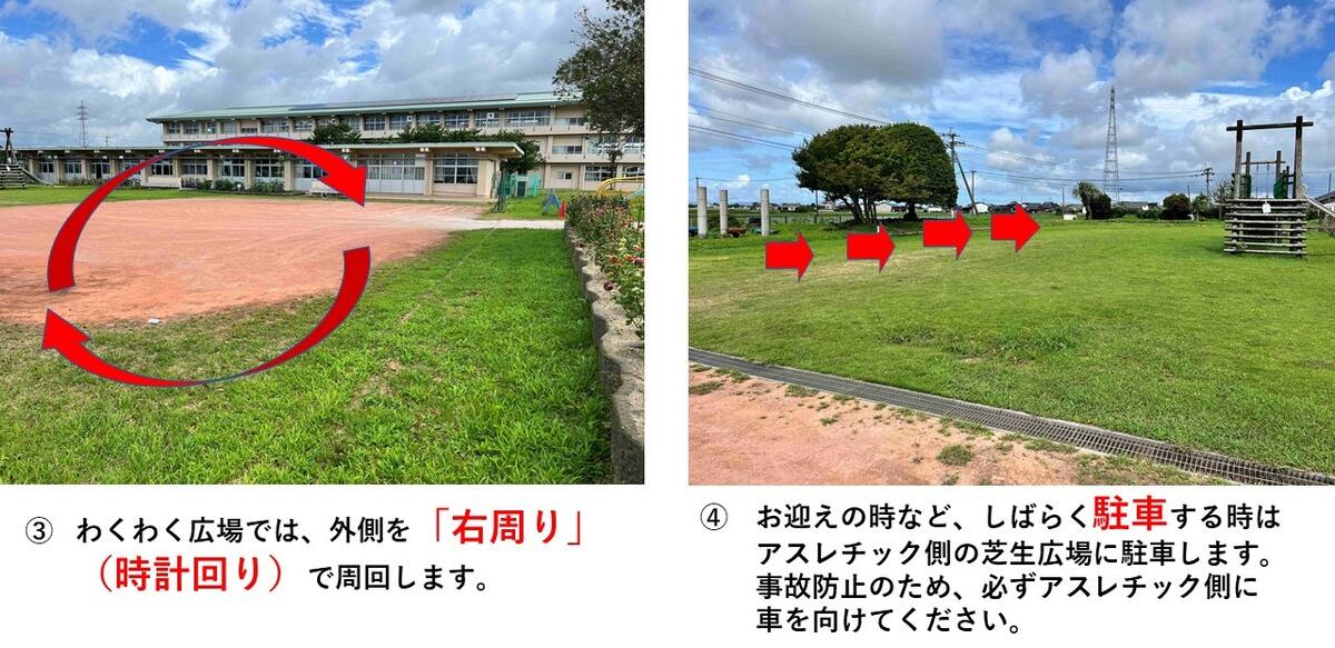 そこで、児童やお迎えの車等の安全確保の観点から、送迎時の駐車場を下記のとおりといたします。
