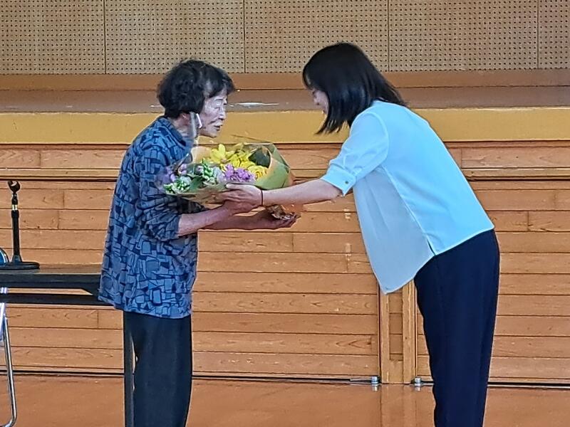 会に先立ち、学校運営協議会の会長(CS会長)として、長年子どもたちのためにご尽力いただきました中園会長がご勇退されますので、感謝の気持ちをこめて花束を贈呈させていただきました。