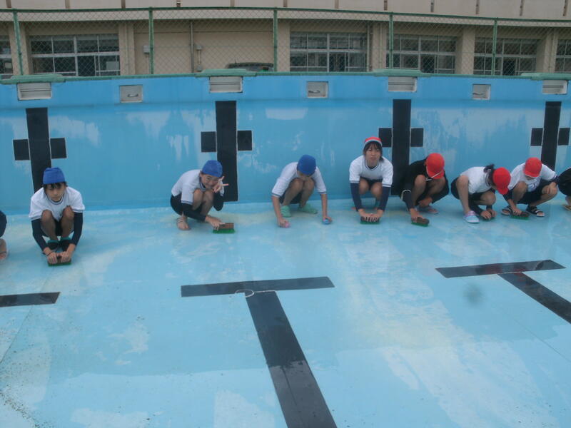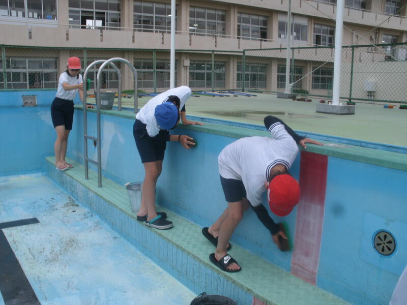 伊藤先生(庁務手)に事前準備やプールサイド等の掃除を入念に行っていただいたおかげで、この日は大プールと更衣室を中心に取り組みました。