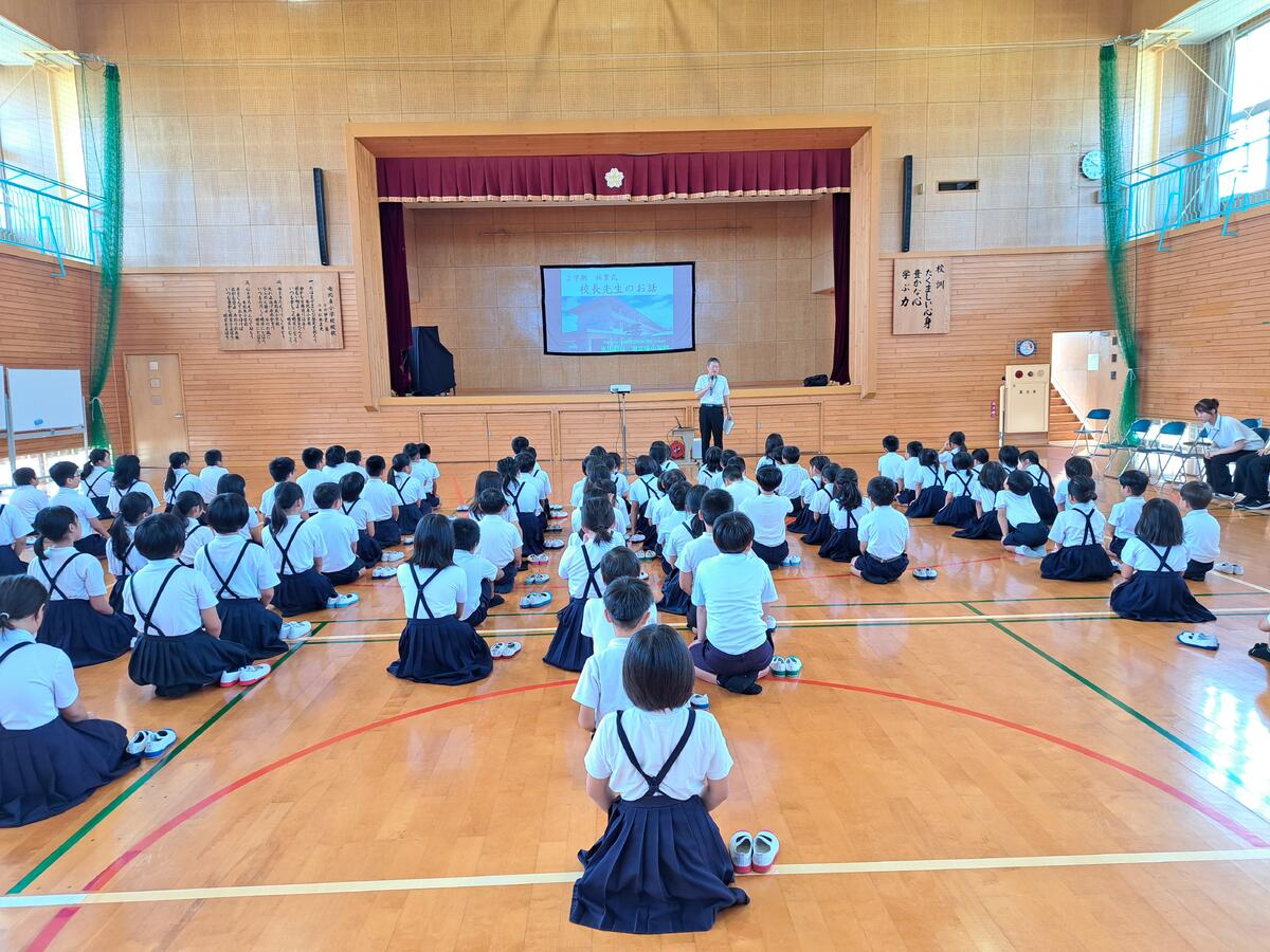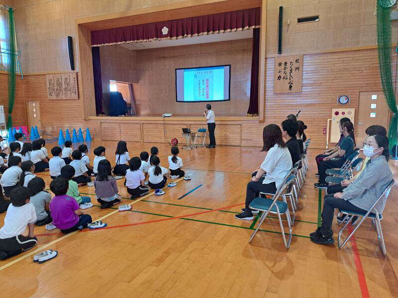 担当の西先生から、「1年生は、初めての新体力テストをがんばること。2から6年生は、昨年の自分の越える越えること」をめあてにし、最後まで全力を尽くすことの大切さについてお話がありました。