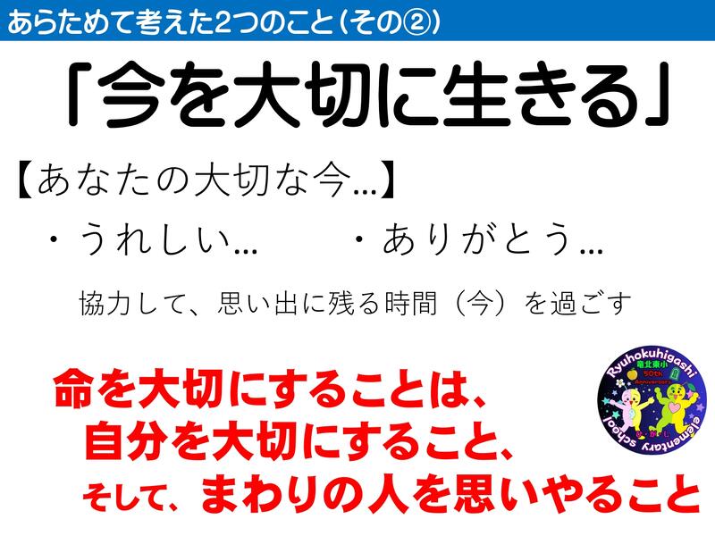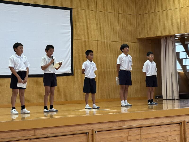 「自分のことを伝えることの大切さ(4年)」、「自分らしく生きることの大切さ(5年)」、「戦争の悲惨さと平和の大切さ(6年)」をテーマに学年ごとに発表し、他の学年の子どもたちから「返し」(感想・気づき)がありました。