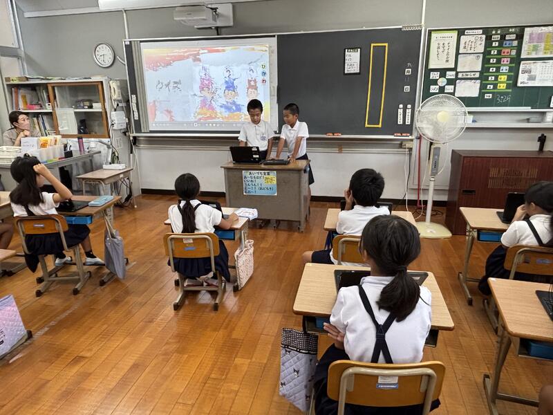 何をしてるのか覗いてみると、生活科の時間に、各グループで調べ、プレゼンにまとめた「町のきらり」を発表していました。発表を聞いている子どもたちは、発表の内容や発表の仕方(声の大きさ、話す速さ)などについて、アドバイスをしています。そして、それをふまえて担任の藤田先生から、今後の取組について確認が行われています。
