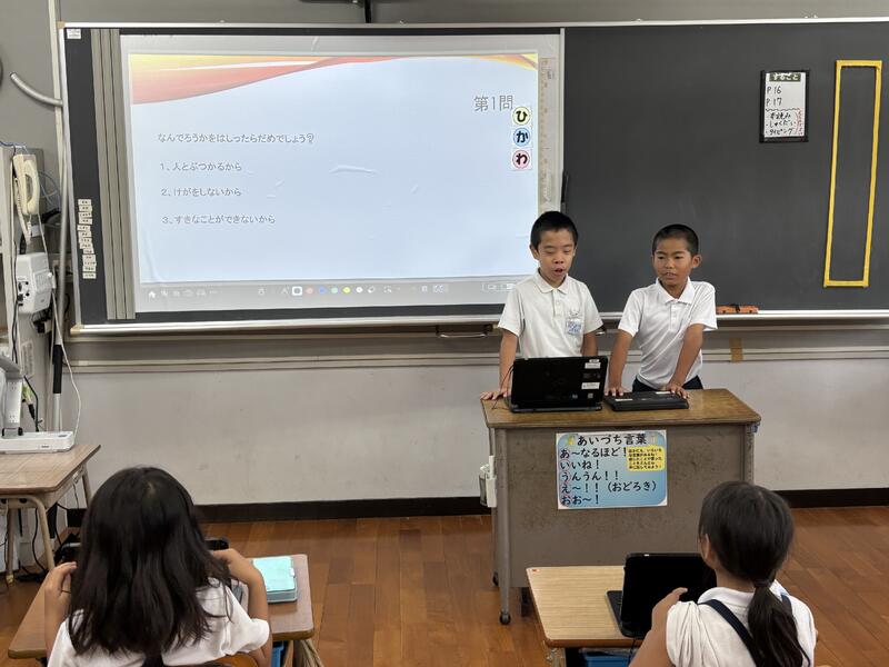 放送委員の仕事や放送室にある放送施設、その他いろいろな活動についてクイズ形式で発表を行いました。