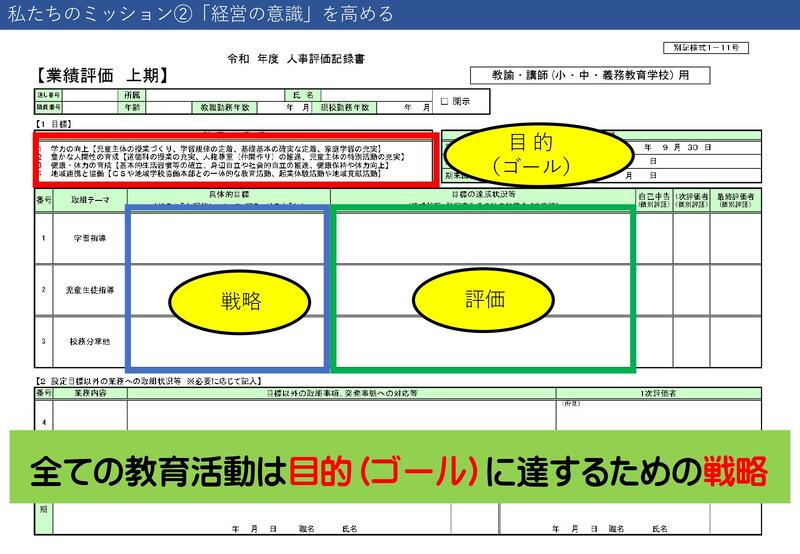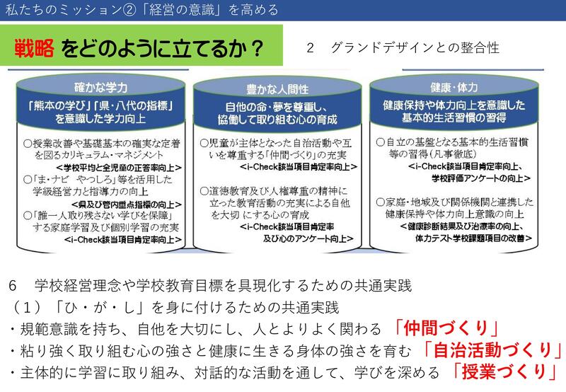 本年度のグランドデザインを念頭に、①私たち一人ひとりが教職員としての資質を高めていくこと ②私たち一人ひとりが学校経営を担っている意識を高めていくことを確認し、2つの共通実践について理解を深めました。