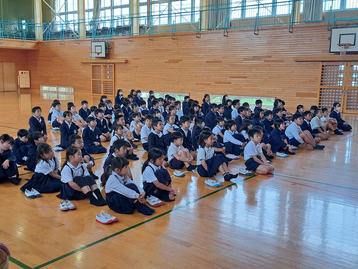 担当の西先生から、来週から「わくわくスポーツフェスティバル」の練習が始まることや「集団で行動するうえで大切なこと」についてお話がありました。