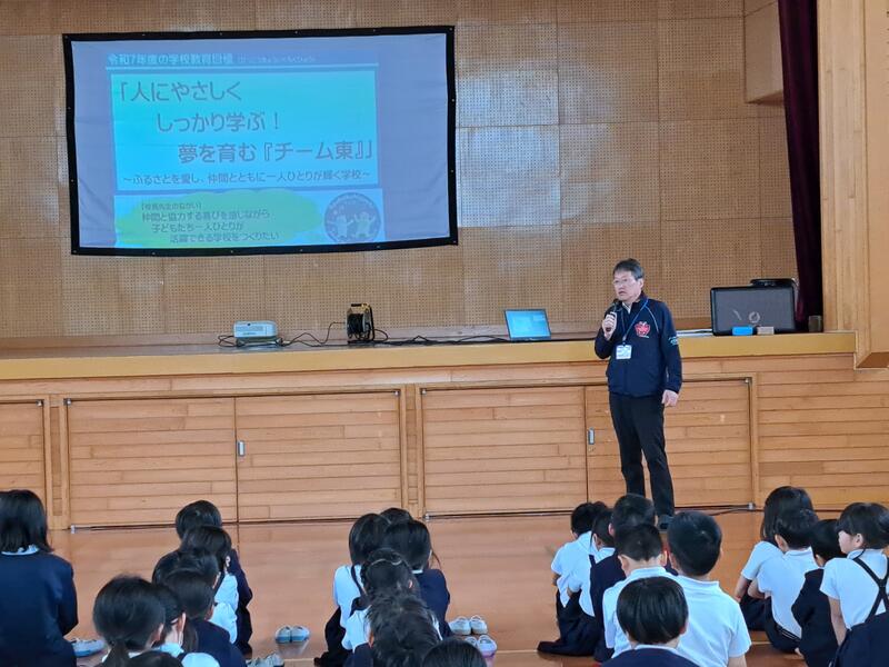 子どもも大人も全員が集い、対面で話を聞くことで、学校生活で大事にしたいことや今取り組んでいることなどを発信したり確認したりできる意義深い時間となっています。