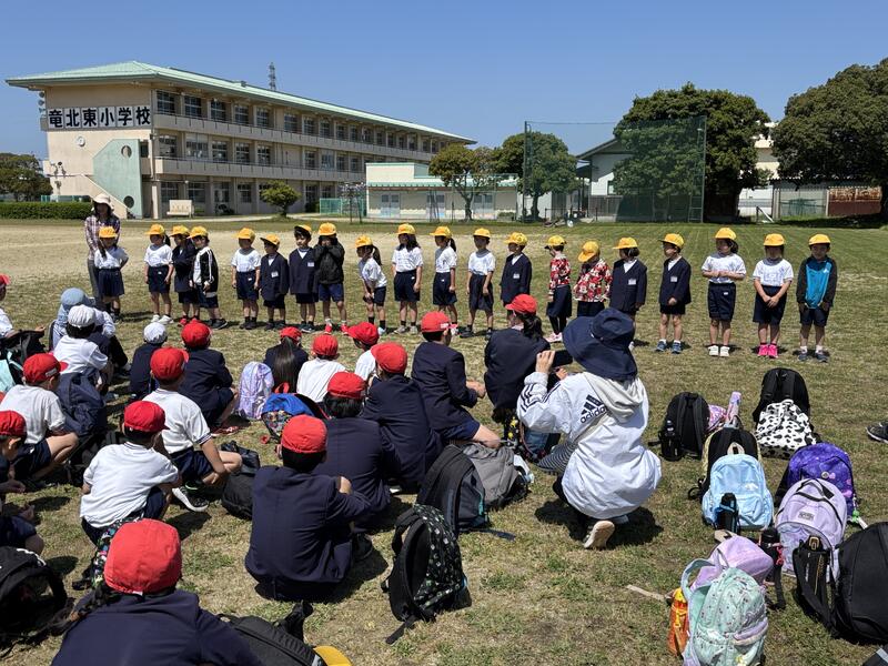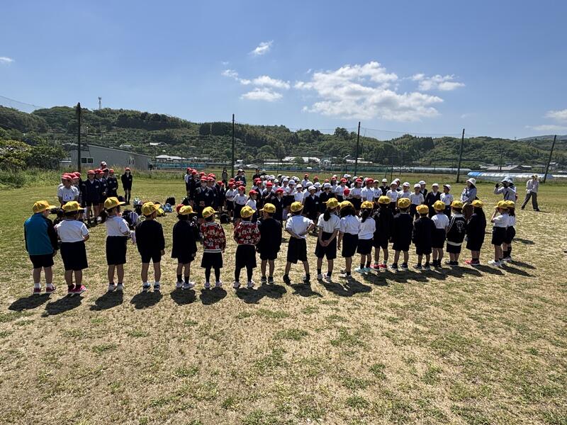 澄み切った青空の下、1年生を迎える会を開催しました。
