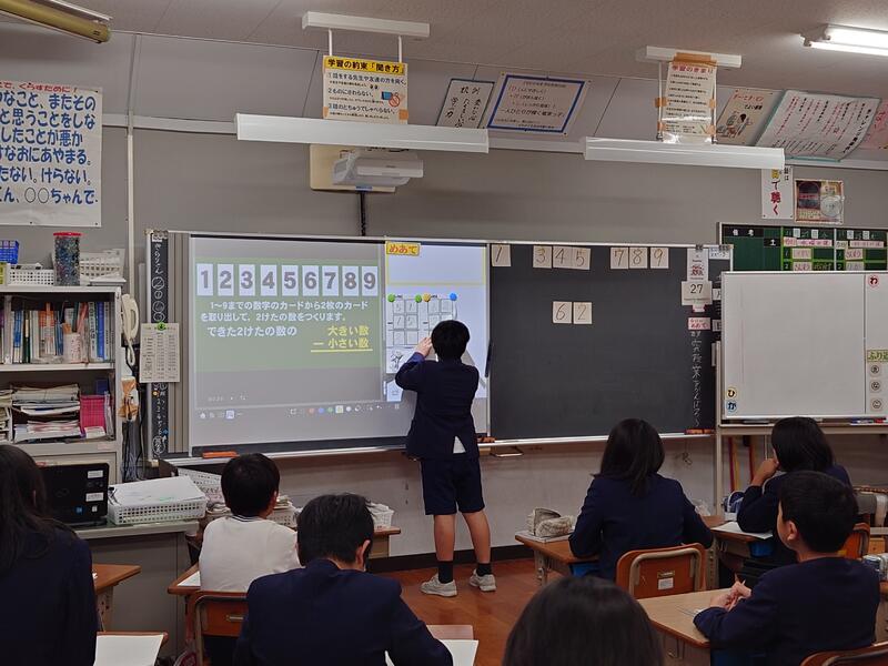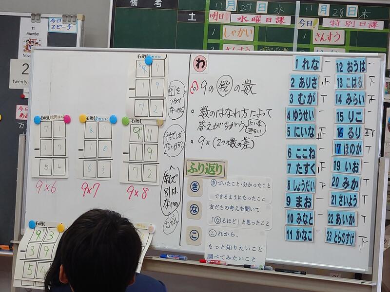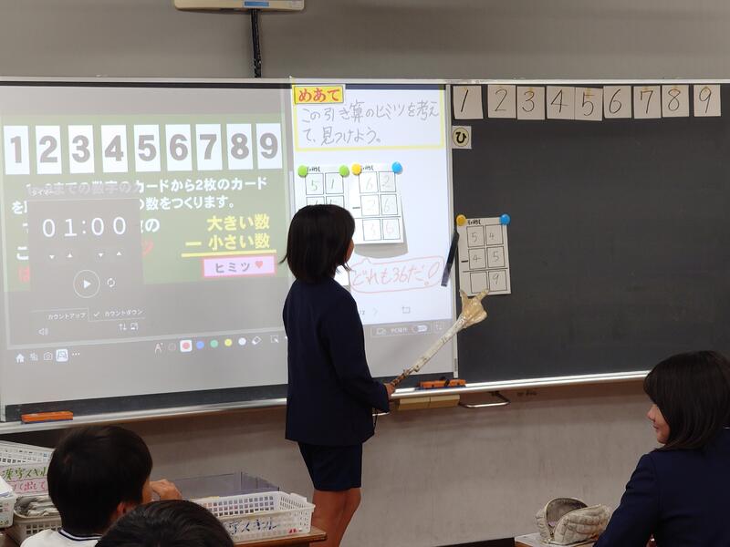 1から9までの数字カードから2枚選び、大きい数から小さい数の引き算の答えのヒミツについて考えるというものです。