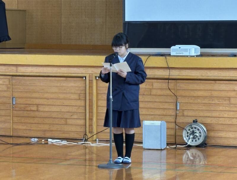 また、今回も中学生の「子ども委員」が参加し、中学生からの視点で「オータム交流会」に係る取組の総括が発表されました。スライドジョーにまとめられた今回の取組(テーマ決め~取材~当日の様子~反省)また文化祭での発展的な学年発表の様子などの紹介がありました。そして、今回の取組をとおして、何を感じ、何を学んだか、これからどのように行動していきたいかなど、一人ひとりの思いを伝えました。