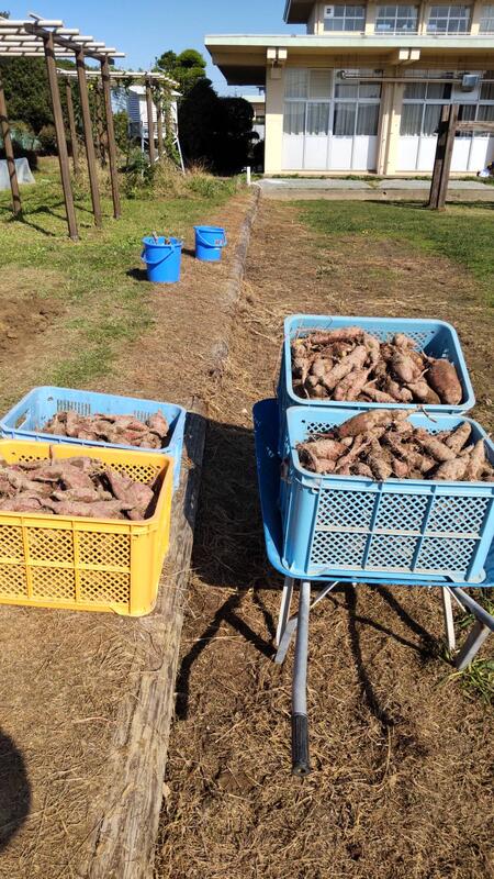 今日は、昼間の好天の下、地域学校協働活動推進員の古閑さん、山村さんと「芋掘り」をしました。