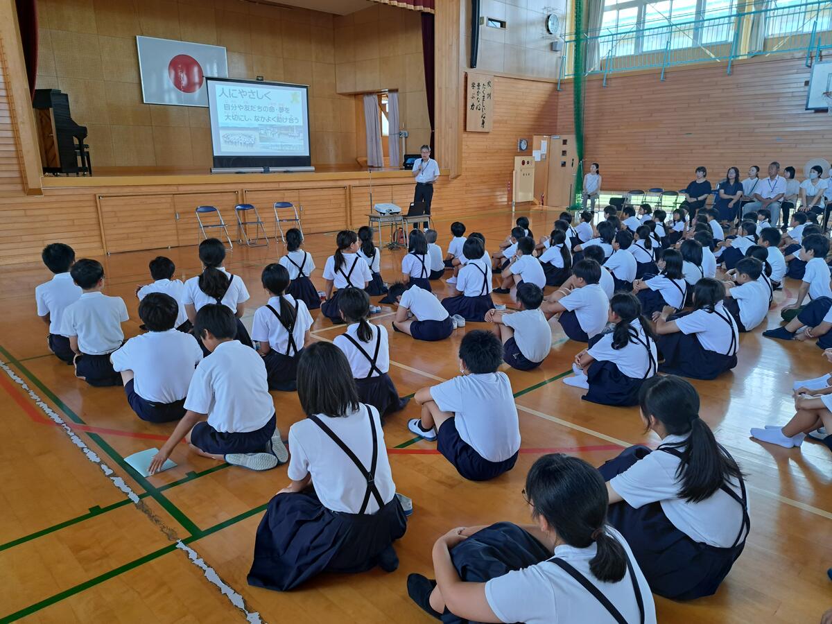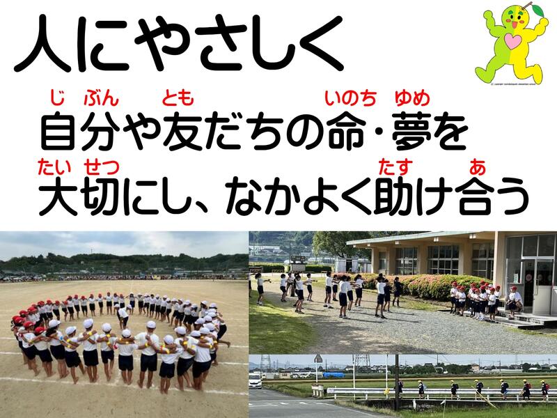 自分や友だちの命、夢を大切にし、なかよく助け合うことが大事ですね。新しい学年になり、何かに夢中になって取り組んだり友だちと助け合ったりしたことってどんなことですか?この写真は、児童のみなさんや先生方、そしてお家の方や地域の方が一つになり取り組んだ「わくわくスポーツフェスティバル」です。とても感動しましたね。また、毎日の登校班、地域の人たちからも、お家の人たちからも、みなさんのあいさつがとてもすばらしいというおほめの言葉をたくさんもらいました。みなさんの姿が認められて、本当にうれしかったです。