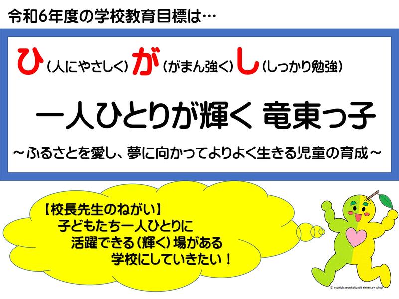 それでは、今日は、みんなで1学期をふりかえりたいと思います。学校教育目標「ひ(人にやさしく)が(我慢強く)し(しっかり勉強)1人ひとりが輝く竜東っ子」にどれだけ迫ることができたでしょうか?みんなで振り返ってみましょう。