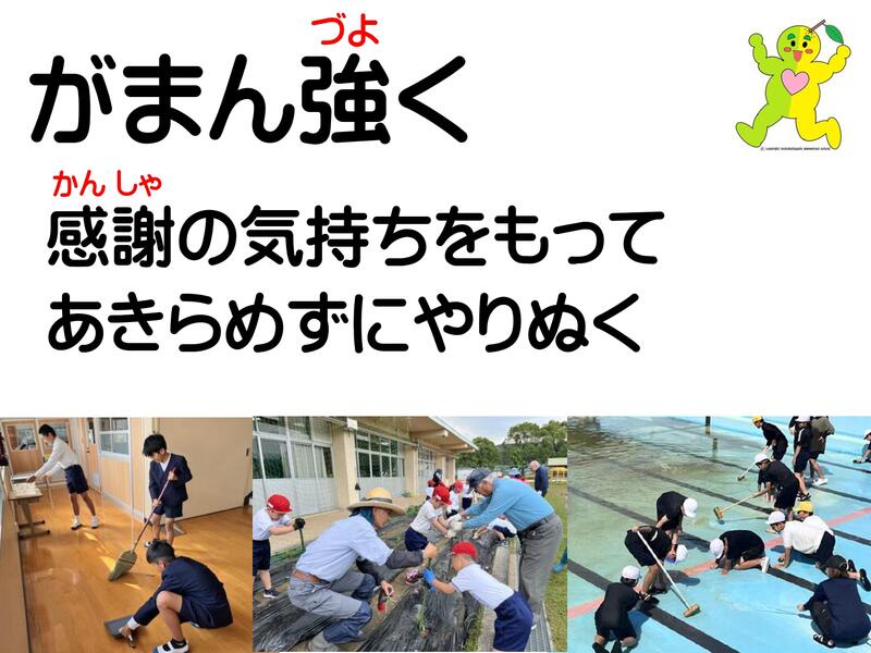 感謝の気持ちをもって、あきらめずに最後までやり抜くことが大事ですね。この学校で一緒に過ごしているすべての人々、この学校で出会うすべての人々に感謝の気持ちをもって取り組んだことってどんなことですか?この写真は、6年生が自発的に始めた朝のボランティア活動、地域のみなさんに協力いただいた栽培活動、全校のみんなが気持ちよくプールに入れるようにとピカピカに磨いたプール掃除です。みなさんが最後まで一生懸命頑張る姿は立派でした。
