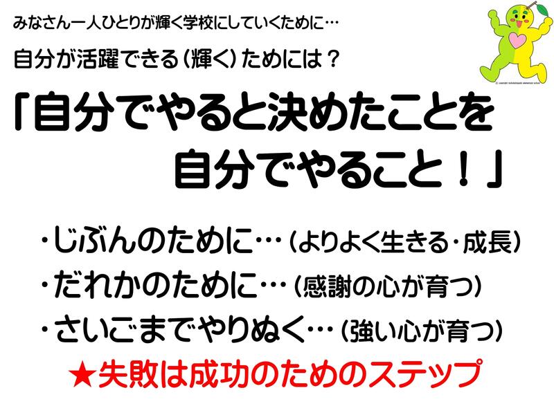 皆さん一人一人が輝くためには、みなさん一人ひとりが「自分で決めたことを自分でやること」が大事です。自分のためにやることは、よりよく生きることや成長につながります。誰かのためにやることで、感謝の心が育ちます。最後までやりぬくことで、強い心が育ちます。生きていれば、毎日いろんな事があります。いいこともあれば、悪いことも。それが生きているってことです。一日一日が、かけがえのない人生です。失敗は成功のためのステップです。明るく前向きに過ごしていきましょう。