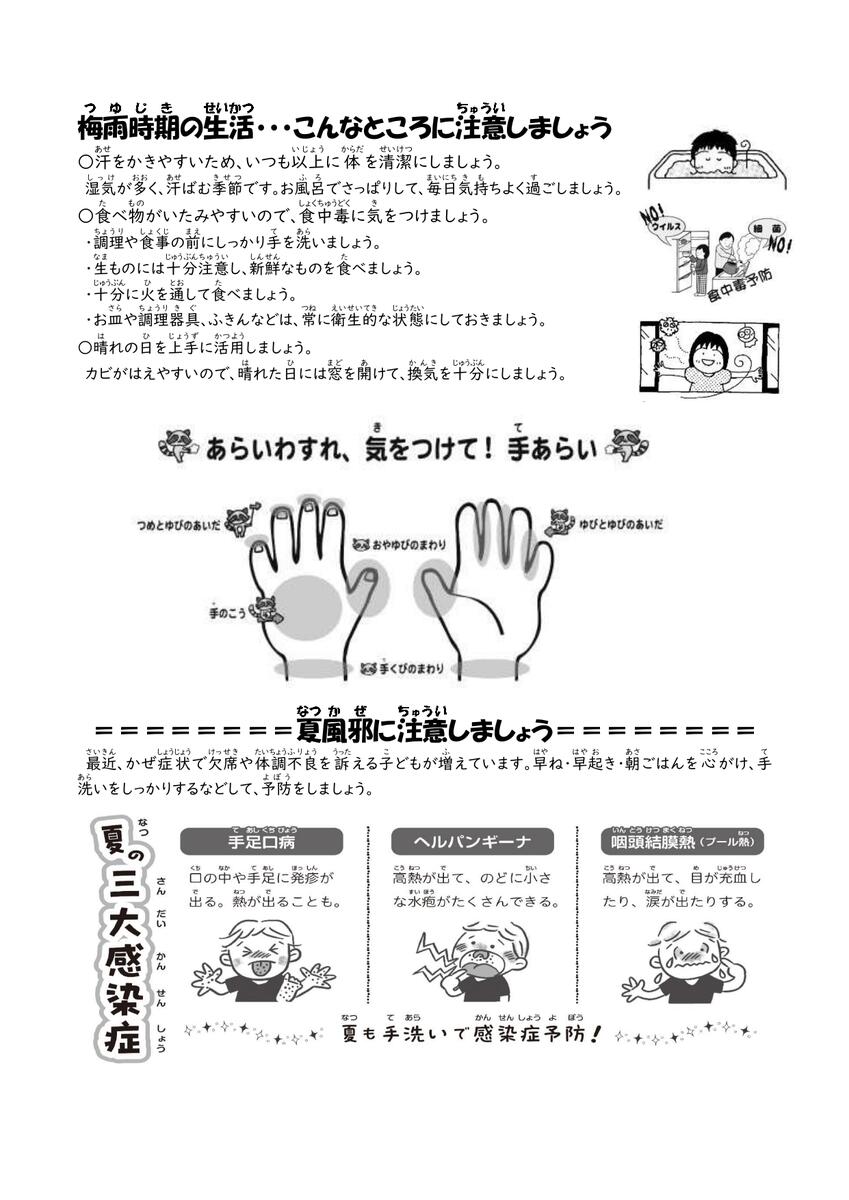 今月のほけんだよりは、「熱中症予防」と「梅雨時期の健康管理」です。