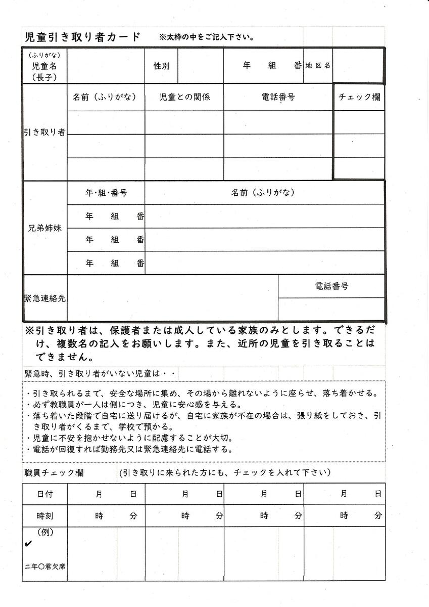 つきましては、事前に「緊急時児童引き渡しマニュアル」の確認や「児童引き取り者カード」の提出をよろしくおねがい