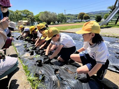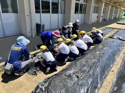 1・2年生が「グリーンカーテンづくり」と「野菜の苗植え」を行いました。