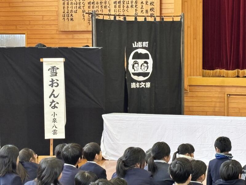 2学期もあとわずかとなりました。今日は、熊本県いきいき芸術体験教室として一般財団法人「清和文楽の里」協会の皆さんに来校いただき、全校児童で人形浄瑠璃「清和文楽」鑑賞・体験を行いました。