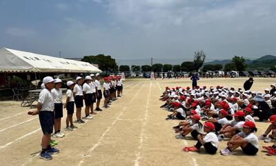 本年度、本校は創立50周年という記念の年を迎えました。前身の南部小学校、東部小学校から数えると150周年になります。記念すべき節目の年に、絶好の晴天に恵まれ、そしてこのように大勢の皆様に見守られ、運動会を開催できることをうれしく思っています。