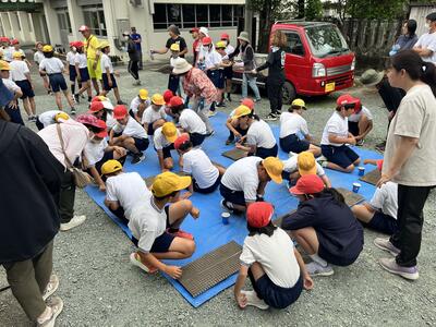 ツーリズムの方の指導の下、東小学校と西部小学校の2人組のペアをつくり作業を進めました。