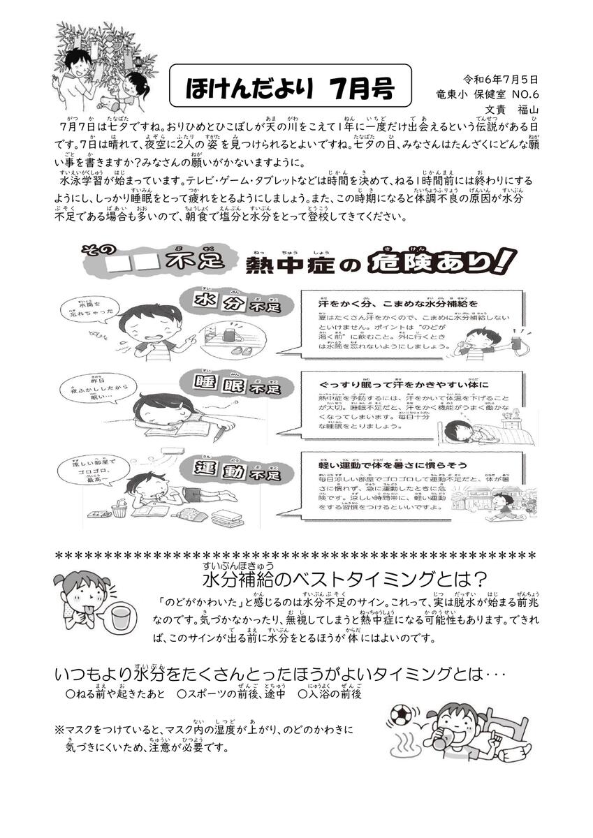 今月のほけんだよりは、「熱中症予防」と「梅雨時期の健康管理」です。