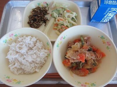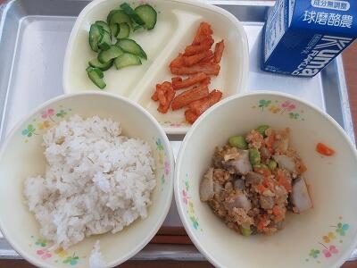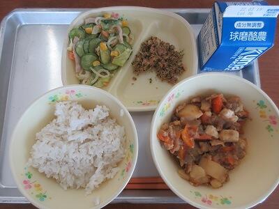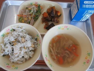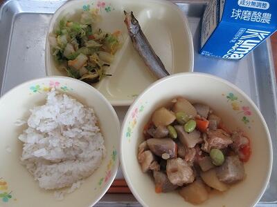 今日もおいしくいただきました。秋の味覚カレーは、ほくほくで甘ーいサツマイモときのこたっぷりでおいしかったです。みそまめを食べて「先生、なんか豆が甘かったです(゜Д゜)!」と。甘辛く青のりたっぷりでした。