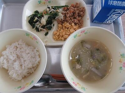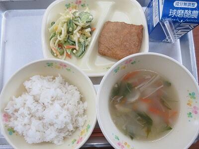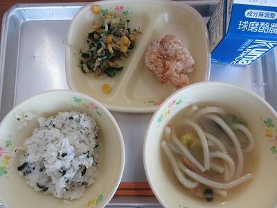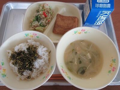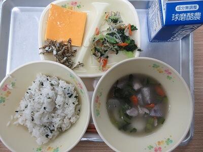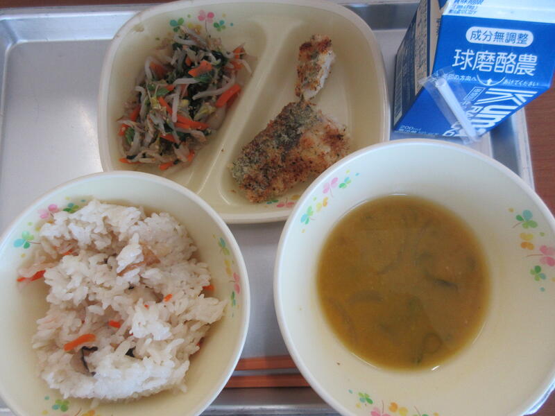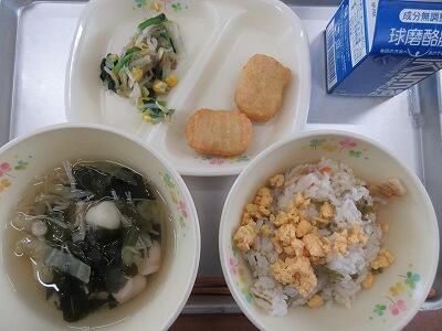 今日もおいしくいただきました。おうちで献立を見て「今日はわかめごはん♪」と言っている子がいました。きっと給食を楽しみにしているんだなぁと感じました。「菜の花あえ」は、ほうれん草とコーンで菜の花畑を表しているすてきなネーミングのメニューでした。