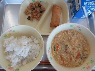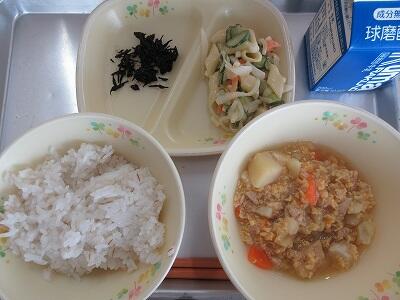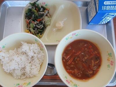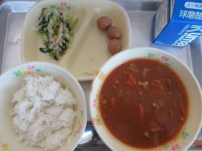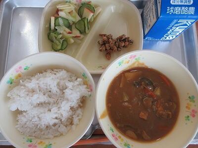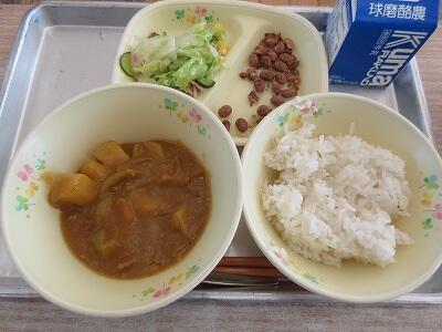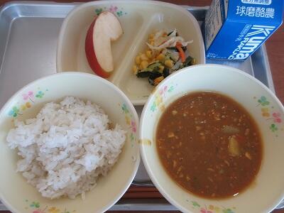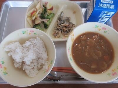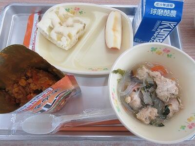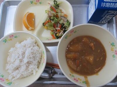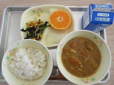 今日もおいしくいただきました。今日は、みんなうれしい「カレー」の日でした。いつもおきまりの「昨日もカレーだったよ~」の声は、今日はきかれませんでしたが、きっとそんな子もいたことでしょう。また、今日はりんご→スイートスプリングに変更でした。このスイートスプリングは、氷川町高塚の西村さんから寄贈していただいたものだそうです。さわやかな甘さで、おいしかったです。