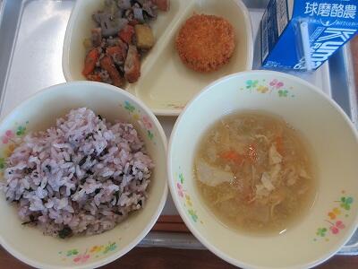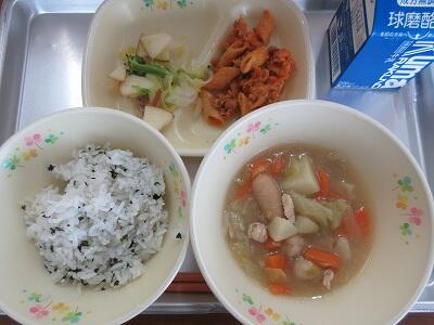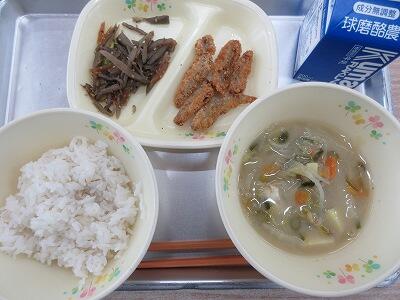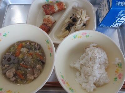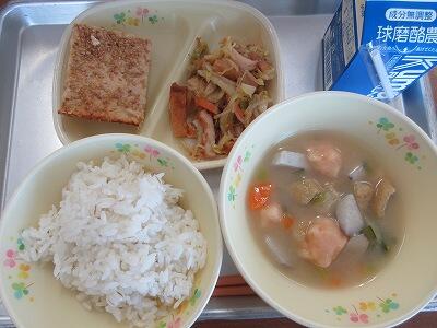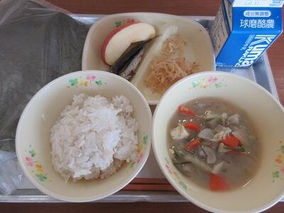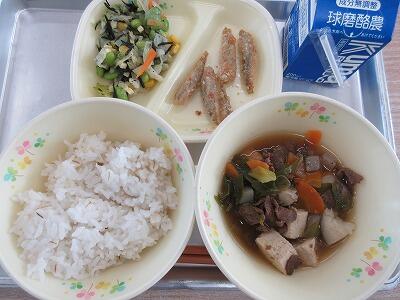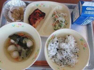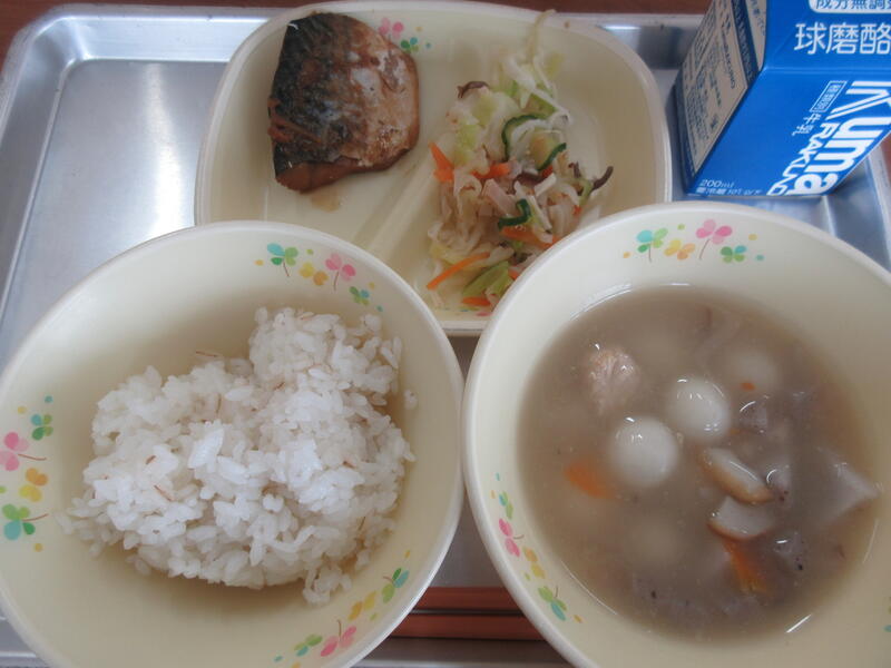 今日もおいしくいただきました。献立を見て「せんべいじるってなに~~??!!」と楽しみにしていた子どもたちでした。もちもちで、せんべいのような形のものが入った汁でした。何からつくられているのでしょう。もみあえには、細く切ったたくあんが入っていておいしかったです。