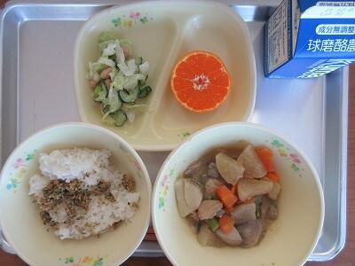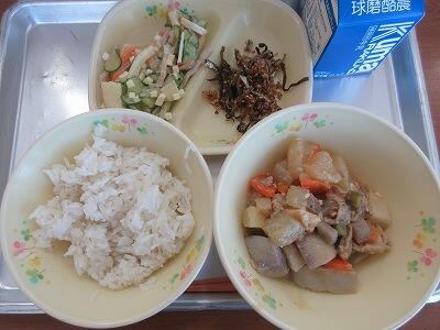 遅くなりましたが、25日(金)の献立です。その昔、お米が貴重だったころ、雑穀や野菜を混ぜて炊いたご飯を「かて飯」と呼んでいたようです。「大根飯」は、その「かて飯」の一つだそうです。
