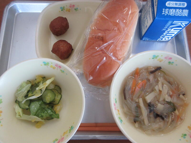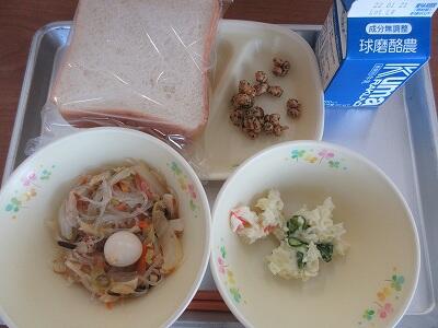 今日もおいしくいただきました。春雨の担々麺は、あったかくて寒い日の冷えた体にしみました。ジャガイモの中華サラダは、どんな調味料で味付けがされているんだろうと気になるほど、とってもおいしかったです。山盛りにおかわりをしている子もいました。