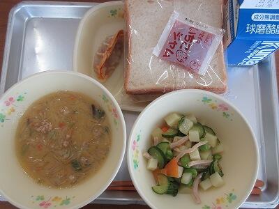 今日もおいしくいただきました。ハヤシライスも人気メニューで、おかわりの子どもたちがたくさんでした。ビーフンサラダのビーフンはそうめんに似ていますが、原料がちがうそうです。そうめんは小麦粉、ビーフンは米粉からできているんだそうです。今日のビーフンは、いつもの細いタイプではなく、冷や麦ぐらいの少し太めのサイズでした。
