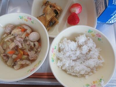 今日もおいしくいただきました。今日は★ふるさとくまさんデー★。氷川町のイチゴとキャベツが使われた献立でした。随分前から「いちご」のメニューを見つけて楽しみにしていた子もいたようです。