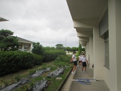 6年生が体育館への渡り廊下を水を流してきれいにしてくれました。3年生は教室のまどをしっかりきれいにしていました。がんばりましたね。しばらく休みに入りますが、また2学期も気持ちよくスタートできそうです。