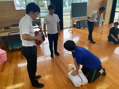 昨日は職員研修で、もしものときに備えてAED・心肺蘇生講習を行いました。