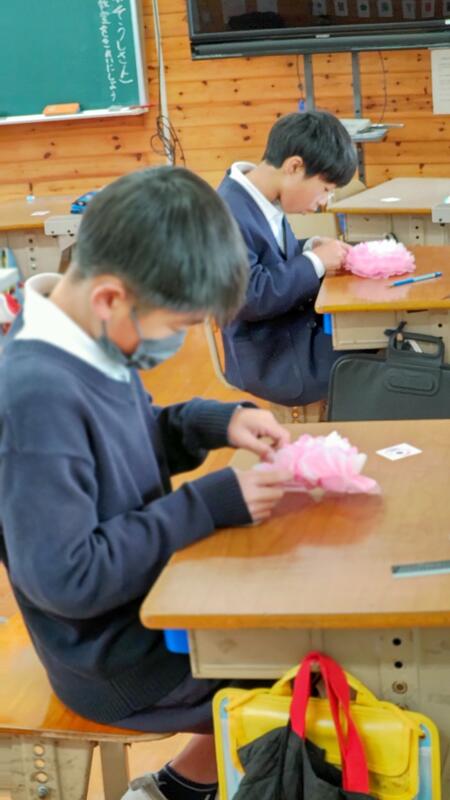 卒業式まで残りわずかということで、4年生は卒業式を彩る紙花を作成しています。