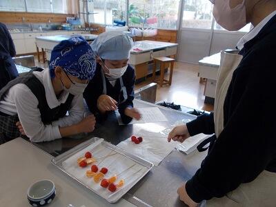 いちごとみかんを竹串にさし、フライパンで砂糖と水を加熱して「あめ」を作りますその「あめ」にフルーツをくぐらせて完成ですが、「あめ」を作るのがむずかしかったです